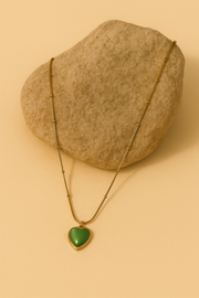 Elevate your style with the Verdant Heart Charm Necklace — a fresh symbol of elegance and serenity. The lush green heart-shaped pendant, cradled in a gold-tone bezel, hangs from a sleek snake chain, creating a delicate yet bold statement. A soulful pick for those who love unique sophistication with a pop of color.
