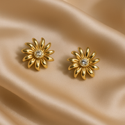 Bloom with elegance The Celeste Floral Studs are crafted in a radiant daisy motif with a crystal center that catches the light beautifully. These anti tarnish earrings blend playful charm with refined glamour perfect for brunch dates, weddings or a mood lifting everyday look.