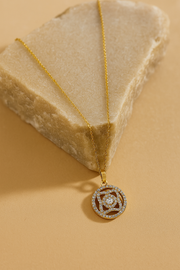 Enclosed in a circular CZ halo, the center features a delicate rose-shaped motif inlaid with sparkling white CZ stones. Minimal yet elegant, this necklace is perfect for romantic evenings, gifting, or everyday glam.