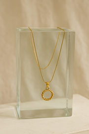 The Twisted Golden Loop Pendant is a minimalist classic — featuring a sleek open circular pendant with a subtle twisted rope texture. Hanging elegantly from a fine gold chain, this piece is clean, timeless, and versatile, making it a must-have for both office wear and casual elegance.