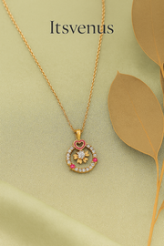 Crafted with a dazzling CZ-encrusted circular frame, this pendant features a golden floral motif at the center, a delicate pink enamel heart at the top, and dainty pink bead accents for a touch of playfulness.