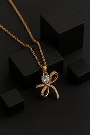 A charming bow-shaped pendant featuring a twinkling heart-cut CZ at the center. This piece blends feminine elegance with graceful sparkle, adorned with tiny stones across the delicate bow design.