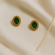 A timeless classic, Emerald Dew Studs feature a deep green oval stone encased a golden beaded rim. These minimalist beauties are perfect for daily elegance or festive charm. Lightweight and anti- tarnish, they blend tradition with lasting shine.